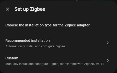 For ZHA use recommended installation, this is the easiest way to set up a zigbee network. If you need Zigbee2MQTT use custom.