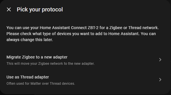 - Do you want to configure this adapter for Zigbee or Thread?