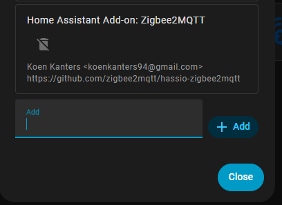 https://github.com/zigbee2mqtt/hassio-zigbee2mqtt - Click Add, then Close