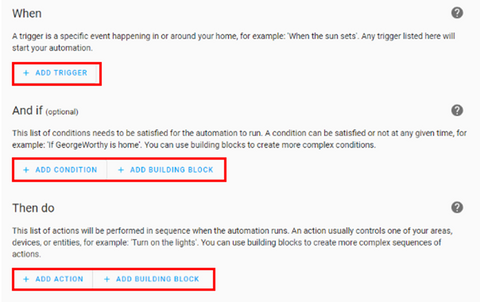 • Click Add Trigger and select the type of event, such as time, sensor activation, or device updates.