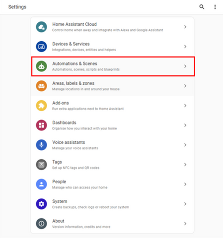 1. From the Home Assistant dashboard, navigate to Settings > Automations & Scenes.