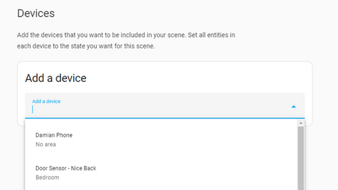 Choose the devices or entities you want to control in your scene, such as lights, blinds, or thermostat.